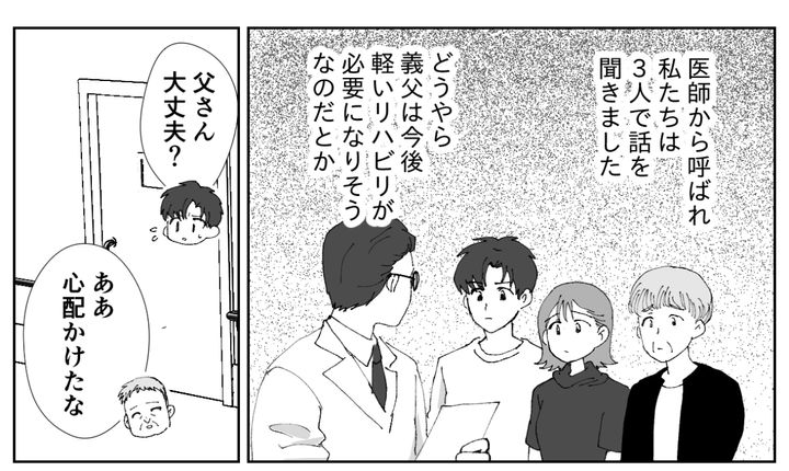 しばらくして医師から呼ばれ、私たちは3人で話を聞きました。どうやら義父は今後、軽いリハビリが必要になりそうとのことです。