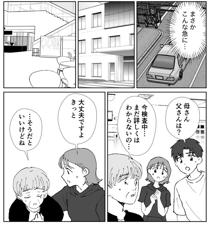 元気そうに見えていた義父でしたが、急に倒れるなんて……本当に驚きました。病院に着くと、心配そうな顔をした義母がいました。義父は現在検査中とのことで、まだ詳しいことはわからないと言います。私は「きっと大丈夫ですよ」と義母に声をかけました。