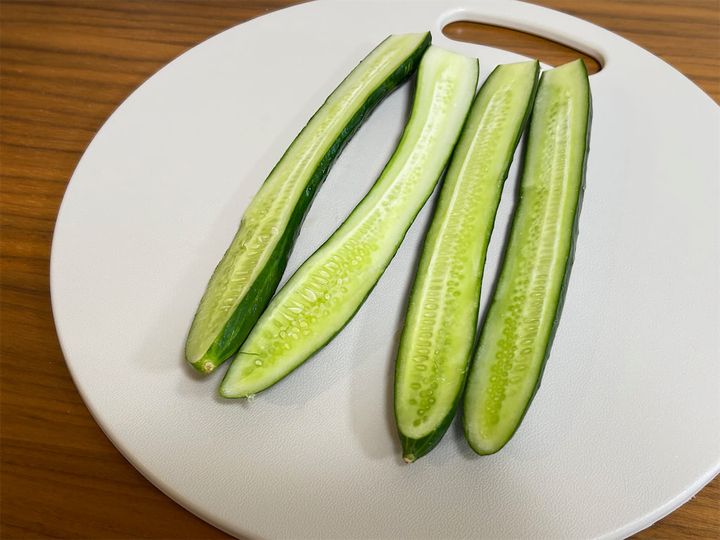 1. きゅうりはヘタを切り落として、縦半分に切ります。