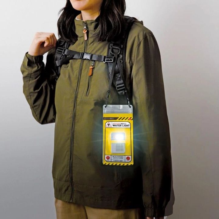 こうしたタイプは既に数多くの製品が発売されていますが、最近になって注目を集めているのが、2025年7月に発売された「COGIT防災 水だけで光る緊急ライト」です。同製品は本体重量がわずか85gという軽量・コンパクトなパウチ型のデザインが特徴で、パウチの穴に付属の紐を通すことで手軽に持ち運び可能で、木の枝などにも吊るせます。