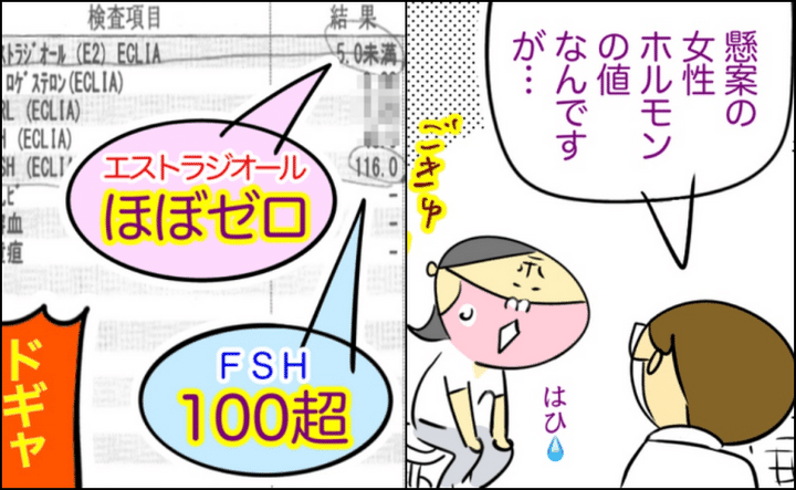 女性ホルモンであるエストロゲンの一種、エストラジオールは血液1mLあたり5pg未満とほぼ0に近い数字で、FSHという卵胞刺激ホルモンは100mIU/mLを超えていました!