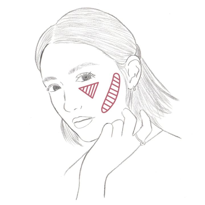 目の下の狭い範囲の内側に、逆三角形状にスティックチークを入れる。さらに、同カラーを頰骨の下あたりから耳上へ、頰をギュギュッと持ち上げるイメージで帯状に塗っていく。2カ所に入れたカラーが繋がってしまわないようにし、頰の中心に隙間を作るのが中顔面短縮のポイント。ローズ系のシェードをチョイスすれば、ピュアなムードも演出できる。