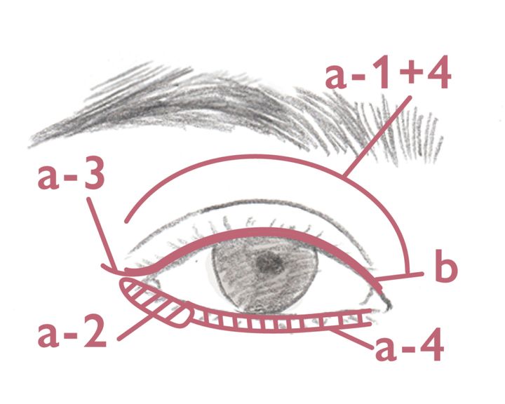a14をブレンドしてアイホール全体に塗ったら、3の焦茶を上の目のキワに入れ、bでアイラインを引く。さらに上からもう1度3を被せて、実際の目尻より外側まで伸ばす。下の目のキワにはa4のベージュを引き、目尻にだけ2のパーリーなホワイトを外側まで長めに伸ばす。