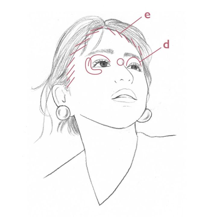 「誰もがエイジングでたるんでしまうのがあご下。このパーツに、横にブラシを走らせるようにしてシェーディングを入れるとシュッとシャープなムードになります。入れるカラーは、赤みのないグレイッシュ系が自然に見えてベスト」