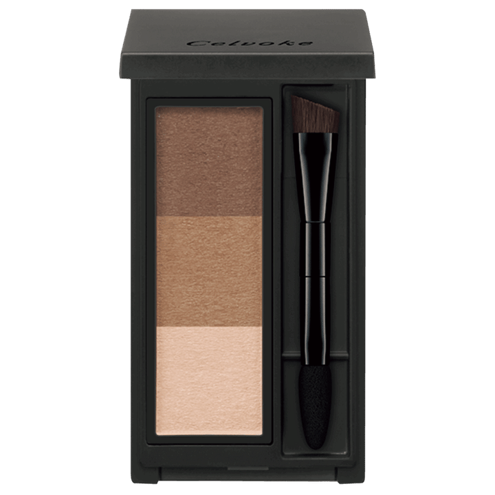 aの色を自眉に合うようブレンドし、まず全体をふわっと描く。次にbのペンシルで毛が足りないところのみ軽く描き足しておき、さらに眉尻を実際より外側まで長く描く。眉山から終着点まではほんの少し下げ気味に。最後にcの右上を眉尻にだけ、実際の輪郭より少しオーバーに重ねる。