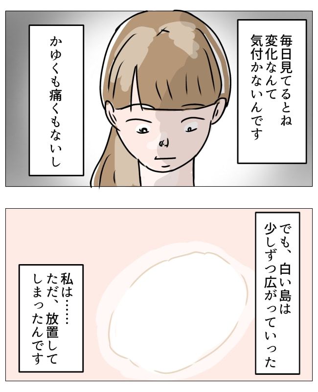 小学生のころにおなかに尋常性白斑(白い島)ができたフワリーさんですが、服で隠れる場所だったこともあり、あまり気にしていませんでした。しかし、フワリーさんの母が気付いてすぐに皮膚科に連れて行ってくれたそうです。でも本人は……。