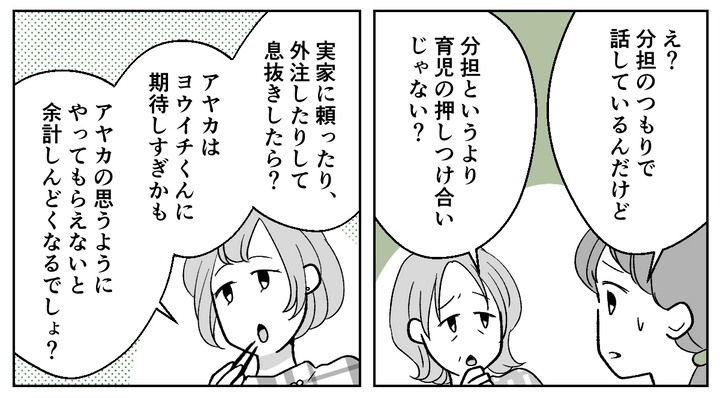 「育児ってそんなにイヤなものなの?」と言う母。私は分担のつもりで話していたのですが、母には育児の押し付け合いのように見えていたようです。一方、姉は「夫に期待しすぎないでもっと息抜きしたら?」というアドバイスをくれました。