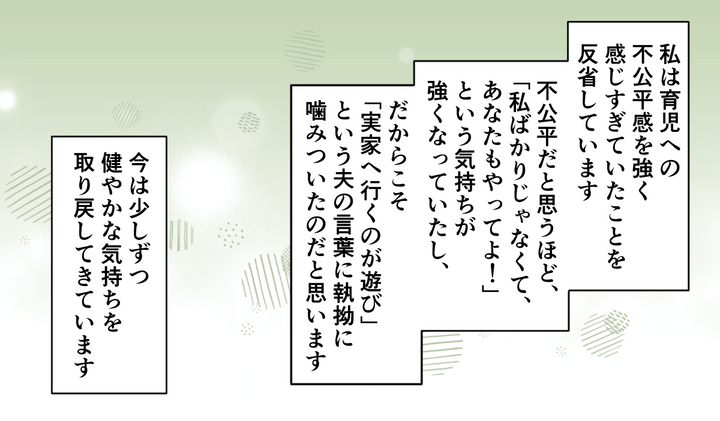 でも実家での話し合いが、私たち夫婦の関係に少しずついい変化をもたらすきっかけとなったのです。母や姉の言葉に背中を押され、私は正社員として職場に復帰。夫もまだ完璧ではないけれど、週末の育児に関わるようになっています。