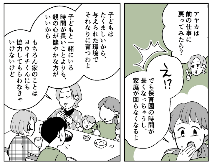 「前の仕事に戻ってみたら?」という母の提案に、はじめは「家庭が回らなくなるし絶対にムリ!」と思っていました。しかし話を聞いているうちに、前職への復帰を前向きに検討してみてもいいような気がしてきたのです。