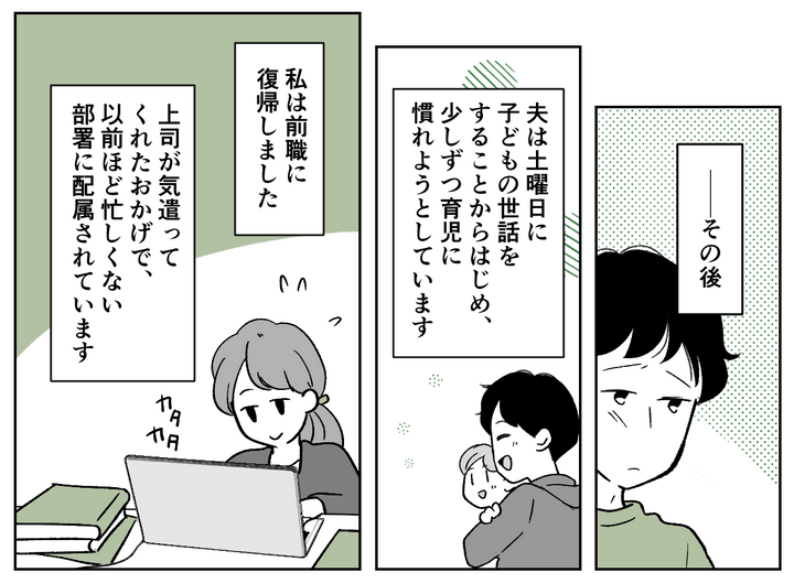 夫は、父親として夫として何ができるかを考える部分はまだまだ足りていませんが、私から具体的な指示をもらうことで気づきが増えているようです。そして私は、夫が変わりはじめたのを機に前職に復帰しました。