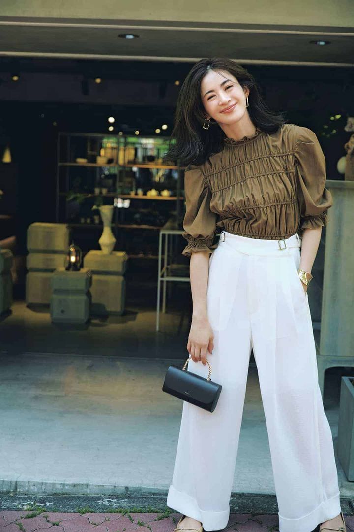 パンツ¥28,600(MIESROHE/MIESROHE ルミネ新宿1店)ブラウス¥9,900(Mila Owen/Mila Owen ルミネ新宿2店)バッグ¥88,000(サルチェ/フラッパーズ)パンプス¥42,900(ヒューン/クルーズ ショールーム)ピアス¥50,600(フェルセラ/ズットホリック)バングル¥11,550(Hh/フォーティーン ショールーム)