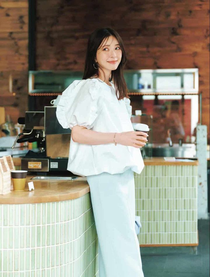 サラリとした素材のブラウスは、裾のバルーンデザインが甘め好きにはたまらない1枚。ふんわりとしたボリューム袖は小顔見せ&二の腕の細見えにも効果的です。パステルブルーのパンツに合わせるだけで、メリハリがついて着映えするシルエットに。洗濯機が使用可能なのもうれしい。