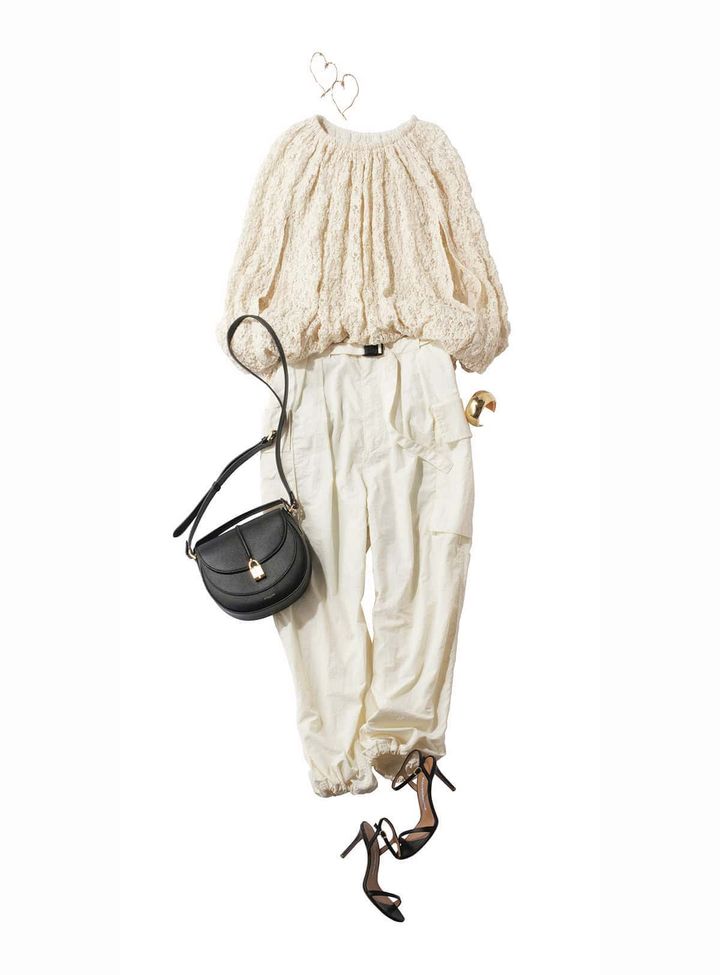ブラウス¥11,000(ブラン)パンツ¥12,700(インディヴィ)バッグ¥19,800(アドカラム/アンソロジー)ピアス¥11,550〈ココシュニック オンキッチュ〉ブレスレット¥140,800〈ココシュニック〉(ともにココシュニック)