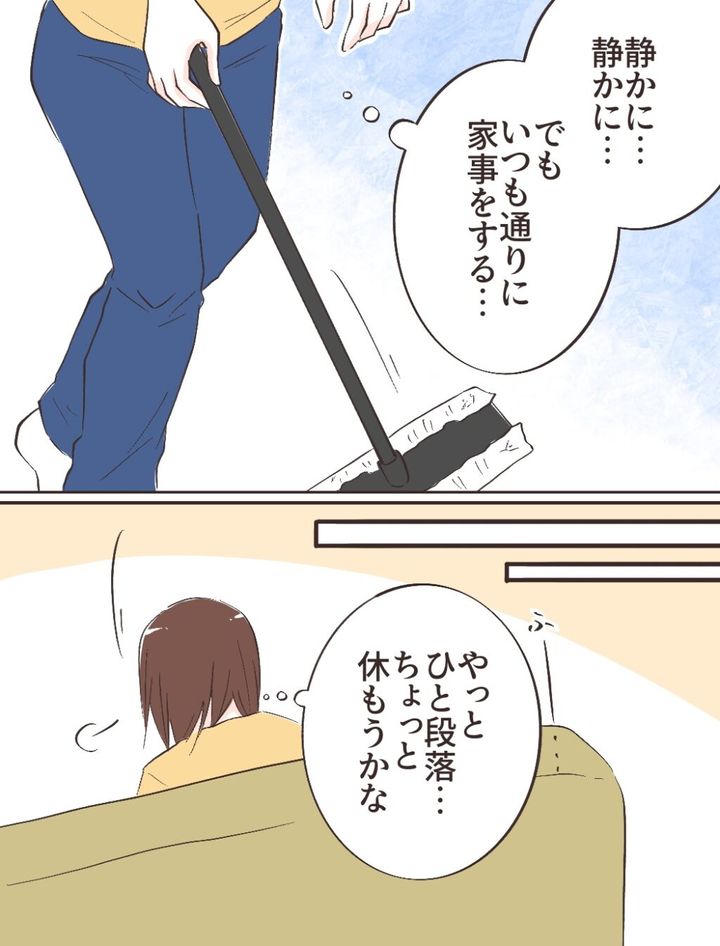 その後、「静かに・・静かに・・でもいつも通りに家事をする・・」と呟きながらフロアモップで掃除をし、「ふー・・やっとひと段落・・。ちょっと休もうかな」とソファに座ると、