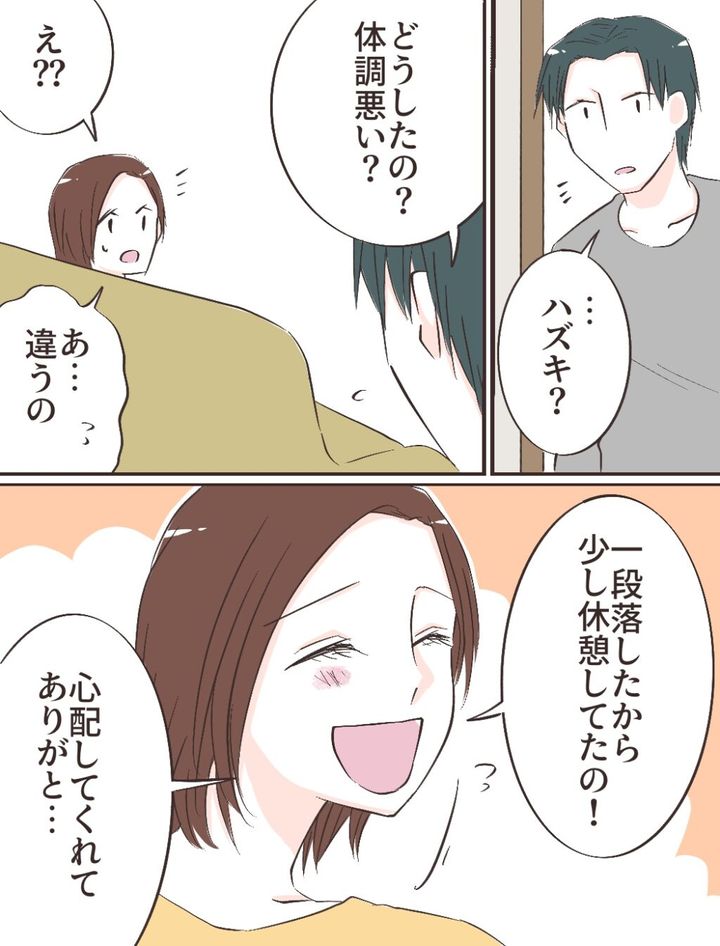 「僕が養うから仕事辞めなよ」とプロポーズされ、仕事を辞めて夫リヒトさんのサポートを頑張ろうと決めたハズキさん。生活リズムを変えるつもりはないと宣言するリヒトさんは、ハズキさんに自分のルーティンに合わせるように求めます。早朝5時にジョギングへ行き、帰宅後にシャワーを浴びて出勤準備をするのがルーティンのリヒトさんは、それに合わせて出来立てのパンを出して欲しい、自分の前ではいつも綺麗な格好をしていて欲しいとリクエスト。要望に応えるため、ハズキさんは朝4時に起床してパンを捏ね、メイクをして身支度を整え、5時にリヒトさんを起こし、リヒトさんがジョギングに行っている間に慌ただしく朝食を準備。「すごい!」と褒めてくれるのを喜ぶハズキさんでしたが、「惜しい!80点」とさらに細かい要望を出してくるリヒトさん。その後、仕事へ行っている間は休憩時間も惜しんで掃除、洗濯、買い出し、夕食作りと家事を頑張るハズキさんですが、帰宅するなり「今日ちゃんと掃除した?」「ベッドシーツちゃんと替えた?」と出来ていない部分を指摘し、「やることリスト」を作ると言い出すリヒトさん。その後、手渡されたやることリストには、掃除する場所と注意点、お風呂掃除に洗濯にアイロンまで・・事細かに支持が書かれていて絶句。「慣れればできるよ!」と言われ、「頑張らなきゃ・・」とハズキさんは覚悟しました。