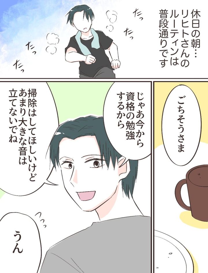 「ごちそうさま」朝食を食べ終えたリヒトさんは、「じゃあ今から資格の勉強するから。掃除はしてほしいけど、あまり大きな音は立てないでね」と言い、「うん」と返事をしました。