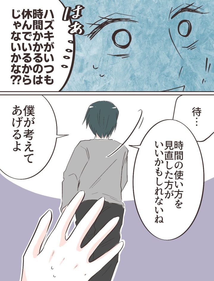 「はぁ・・ハズキがいつも時間かかるのは休んでいるからじゃないかな??」そう言うリヒトさんに、「待・・」と言いかけると、「時間の使い方を見直した方がいいかもしれない。僕が考えてあげるよ」そう言うと、部屋へ入ってしまいました。