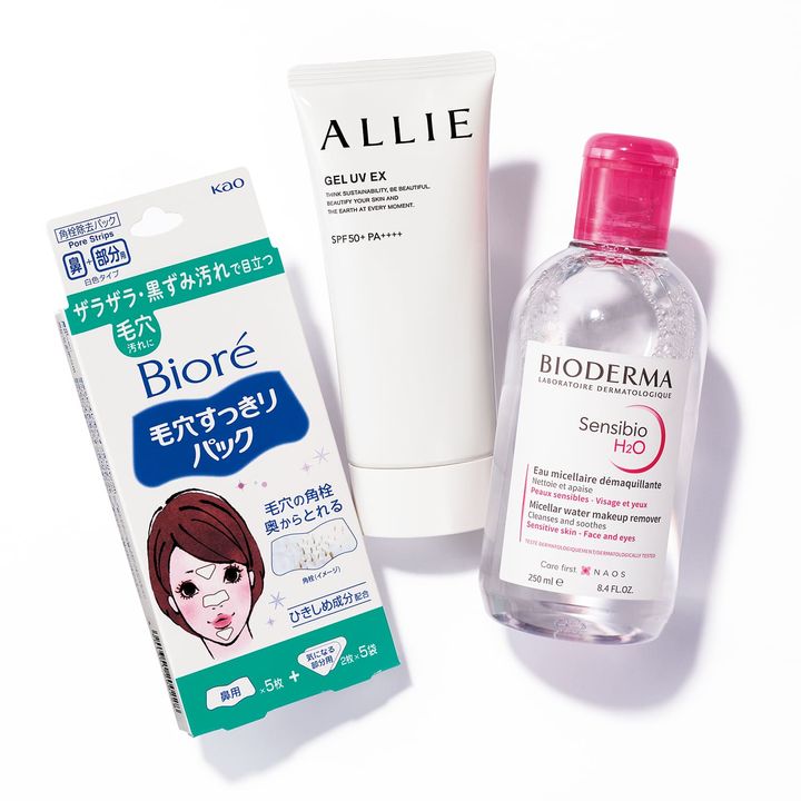 左から:男の子は即効性を求めるからオススメ(笑)。毛穴すっきりパック 鼻用+気になる部分用[15枚]¥440<編集部調べ>(花王)保湿力のあるUVジェル。アリィー クロノビューティ ジェル UV EX SPF50+・PA++++ 90g ¥2,310<編集部調べ>(カネボウ化粧品)肌負担なくすっきり落とせるメーク落としを。サンシビオ エイチツーオー D 250ml ¥2,980(ビオデルマ)