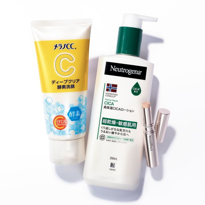 左から:たっぷり使えてさっぱりとした後肌に。洗面台に常備。メラノCC ディープクリア酵素洗顔 130g ¥715(ロート製薬)姉のオススメで、母と僕も虜に。ニュートロジーナ インテンスリペア CICA ボディローション 250ml ¥1,969(kenvue)使いやすく、お互いに質感が好み。ドラマティック エッセンスコンシーラー スティック ライトオークル SPF50・PA++++ ¥3,080(マキアージュ)