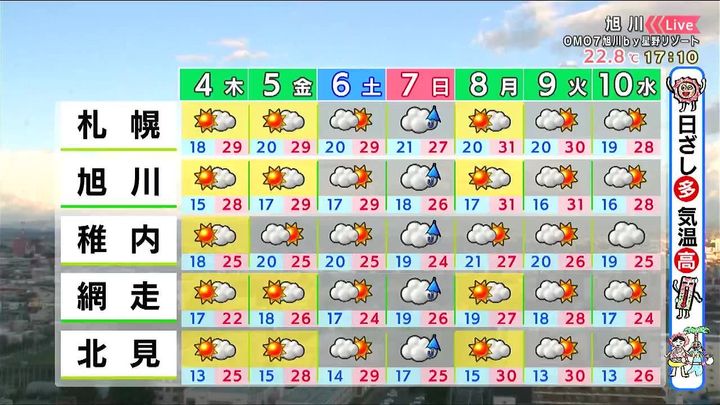 この先は晴れる日が多く、札幌や旭川、北見は連日30度くらいまで気温が上がります。ただ、朝晩は涼しくなるので、布団選びに気を付けて下さい。