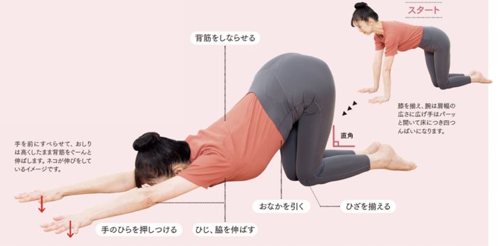 「にゃんこ」ポーズで手、腕、上半身をぐっと伸ばす