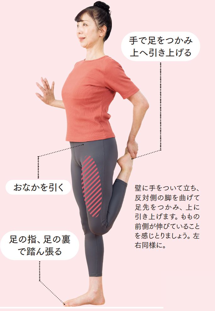 壁に手をついて立ち、反対側の脚を曲げて足先をつかみ、上に引き上げます。