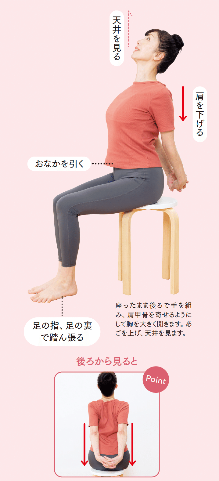 座ったまま後ろで手を組み、肩甲骨を寄せるようにして胸を大きく開きます。あごを上げ、天井を見ます。