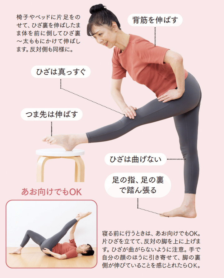 寝る前に行うときは、あお向けでもOK。片ひざを立てて、反対の脚を上に上げます。ひざが曲がらないように注意。手で自分の顔のほうに引き寄せて、脚の裏側が伸びていることを感じとれたらOK。