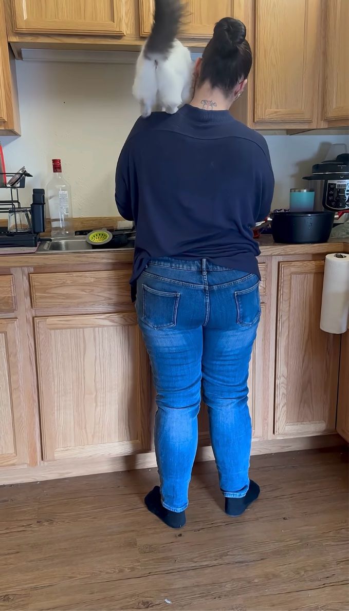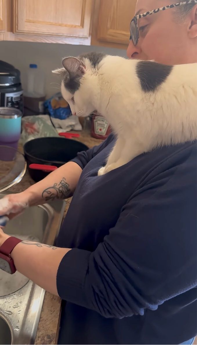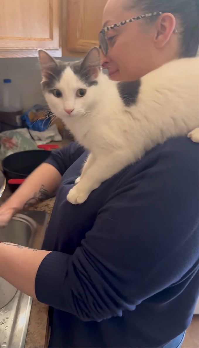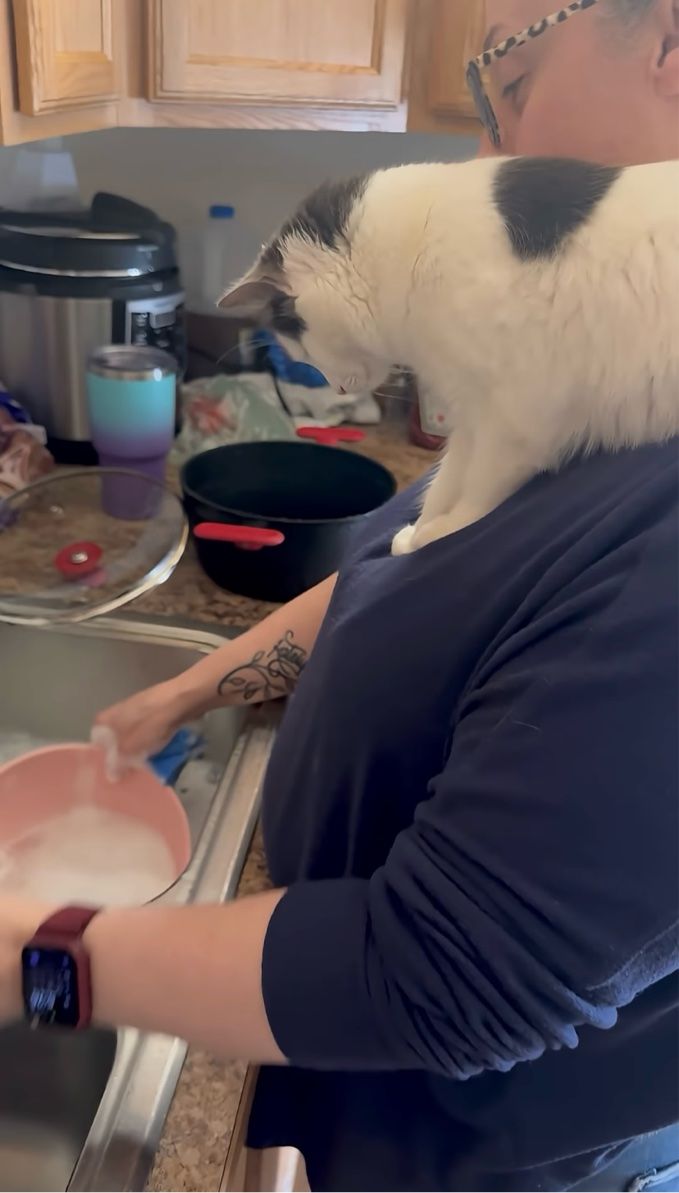 キッチンで皿洗いをしていた女性。 すると、ネコが肩に登ってきて・・・作業の様子を見守ってきました!