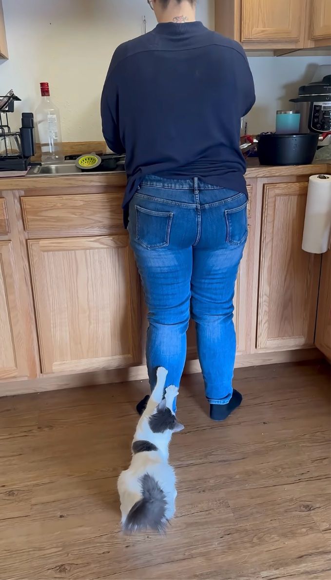キッチンで洗い物をしている女性の足元にはネコの姿が。 この子はおててを伸ばし、踏ん張るように力をため込むような姿勢で構えると・・・
