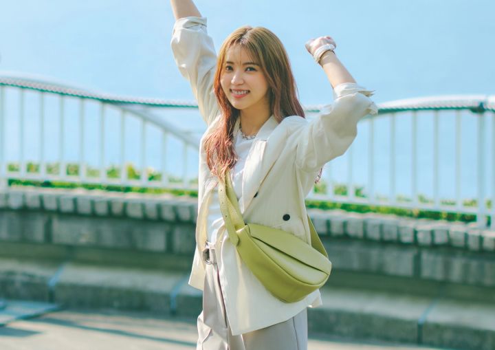 白Tシャツ¥5,490/インディヴィ(ワールド) ハーフパンツ¥10,450/ミラ オーウェン ルミネ新宿2店 ベージュジャケット¥15,400/ココ ディール ボディバッグ¥7,700/オリエンタルトラフィック(ダブルエー) スニーカー¥31,900/ヴェジャ(シードコーポレーション) チェーンネックレス¥19,800、チェーンピアス¥13,200/ともにステラハリウッド スマートウォッチ vivoactive 6 ¥52,800/ガーミン