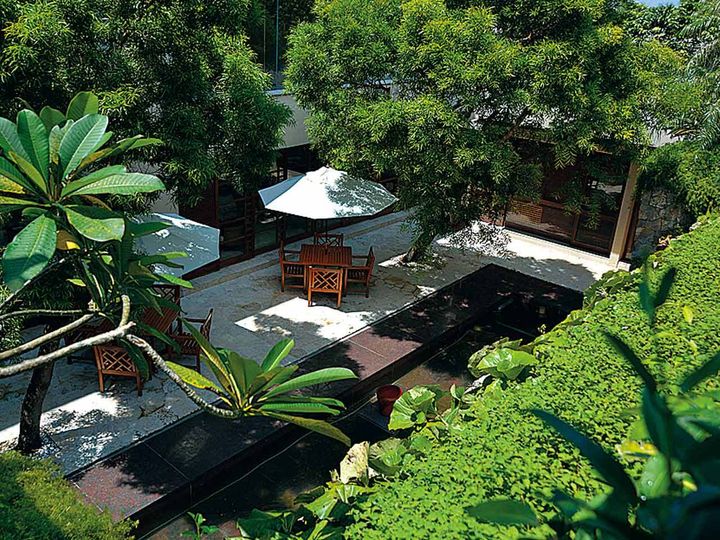 庭に咲く常夏の植物、籐の家具やウッドのブラインドなど南国らしさも漂う。