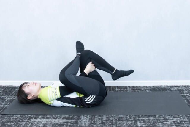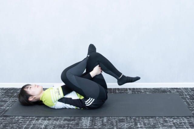 (3)両手でひざを体に引き寄せて、お尻の伸びを感じながら10〜15秒間伸ばす