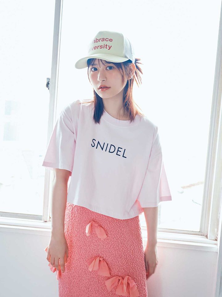 月足天音。ar7月号より 帽子¥11,550/カシラ(カシラ プレスルーム) Tシャツ¥6,930/スナイデル スカート¥19,800/ジユウバイラベルエ チュード(アンティローザ) イヤカフ¥4,400/アウ(ハチマルゴショールーム)