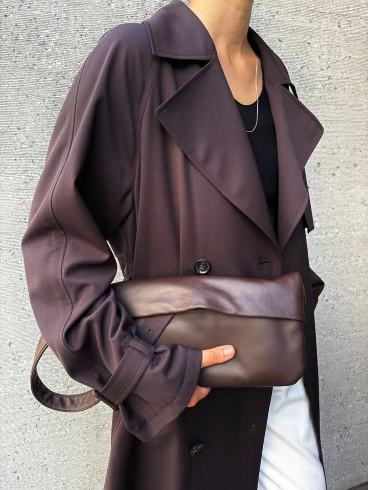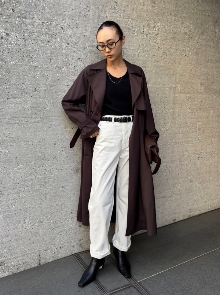 「毎年リリースされているトレンチコートに、今季のキーカラーでもあるブラウンが登場しました。このコートを主役に、中のコーディネートは潔くモノトーンにすることでモダンに。スクエアトゥのヒールブーツを合わせてシャープさをプラスしました。コートの色を目立たせたかったのでバッグもコートと同系色にし、さり気なくブラウンのグラデーションを取り入れました」