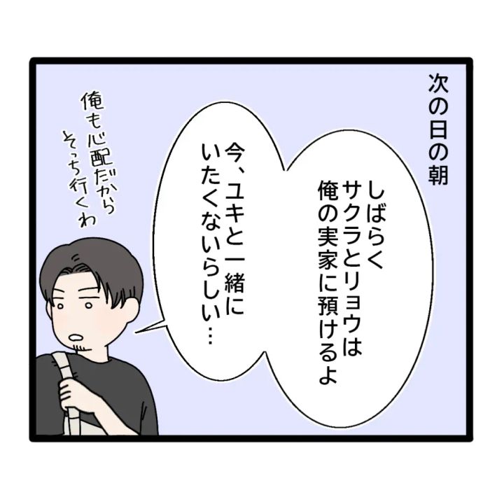 翌朝、夫アサヒから「今、ユキと一緒にいたくないらしい・・・」との理由で子どもたちを義実家に預けると言われました。そしてアサヒまでもが、子ども達と一緒に行くと言うので、私には意味がさっぱり分かりませんでした。