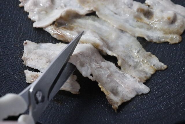 豚肉のカットに使ってみましたが、切れ味も良くサクサク切ることができました。食材が滑りにくいギザ刃を採用していることも、切れやすさのポイントかもしれません。