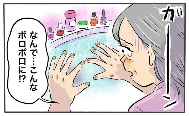 次の転機は、新型コロナの感染拡大とともにやってきました。どこへ行っても手に付けなければならないアルコール消毒液が、50代になってますます乾燥が進んだ私の爪に追い打ちをかけたのです。