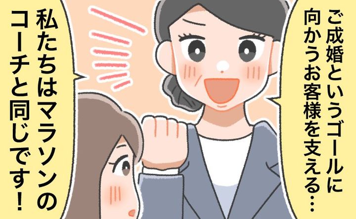 決め手となったカウンセラーさんの言葉は、「私どもはマラソンのコーチと同じです。ご成婚というゴールに向かって走るお客様を支え、励まし、伴走します。共に走り抜けましょう」というもの。
