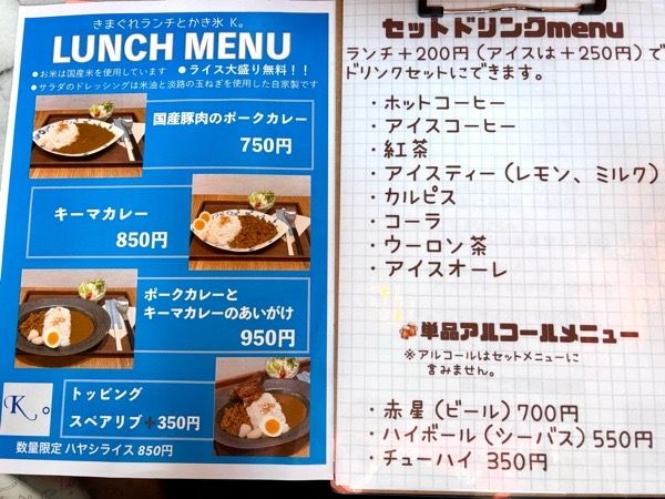 ランチメニューは現在はカレーです。種類は国産豚肉を使用したポークカレー(750円)、キーマカレー(850円)、ポークカレーとキーマカレーのあいがけ(950円)、数量限定でハヤシライス(850円)があります。プラス350円でスペアリブのトッピングもできます。なんと!大盛りは嬉しい無料です。ドリンクはセットで200円からとお得ですね。ランチはすべて現金払いです。