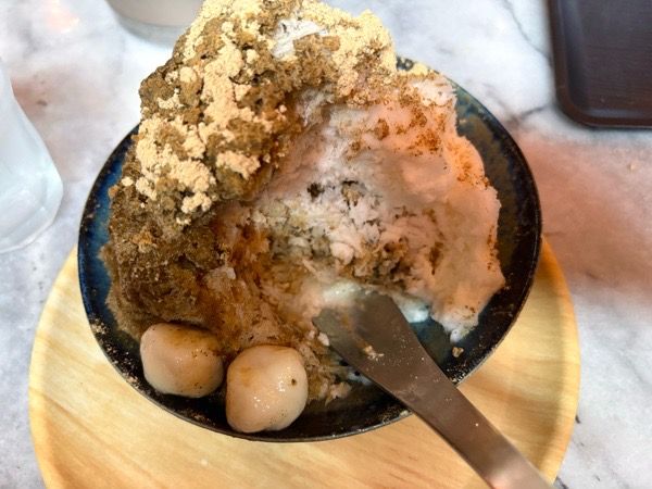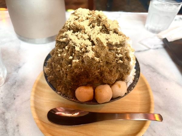 カレーの後はお待ちかねのかき氷です。ももの練乳ミルクは生の桃が上に乗っかっています。中にもどっさり入っていましたよ。自家製の桃シロップも生の桃ならではの甘みがあっておいしい。贅沢ですね~。 ほうじ茶きなこミルクはほうじ茶ときな粉がたっぷりかかって一気に和テイスト。氷が溶けても薄まらず、ほうじ茶きな粉味が続きます。お豆腐入り自家製白玉は3個もついています。もっちもちで和テイストにバッチリ!