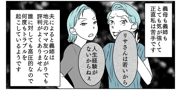 私(リサ、20代)は夫(ユキオ、30代)と3歳の娘との3人暮らし。近くに義両親と義姉(夫の姉、アユミ、30代)家族が住んでいます。私は結婚当初から高圧的な義母(ケイ、60代)と義姉のことが苦手です。2人は私相手なら勝手が許されると思っているのか、私を見下した発言をしてきます。そんな義母たちとは対照的に、義父(シゲル、60代)と義兄(カズアキ、30代、義姉の夫)は穏やかな性格です。義兄に似たのか、義姉の息子(マイト、6歳)も穏やかな子です。