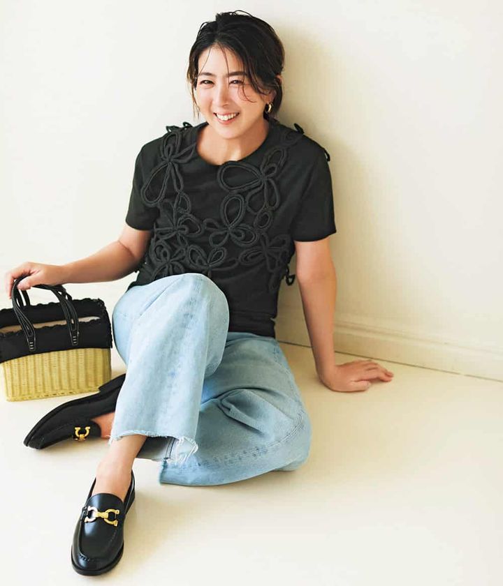 いつもの黒T×デニムもフラワーモチーフのかぎ針編みベストで一気にモード見え。黒ワントーンのほんの少しのモードなレイヤードで気負わないオシャレを満喫。