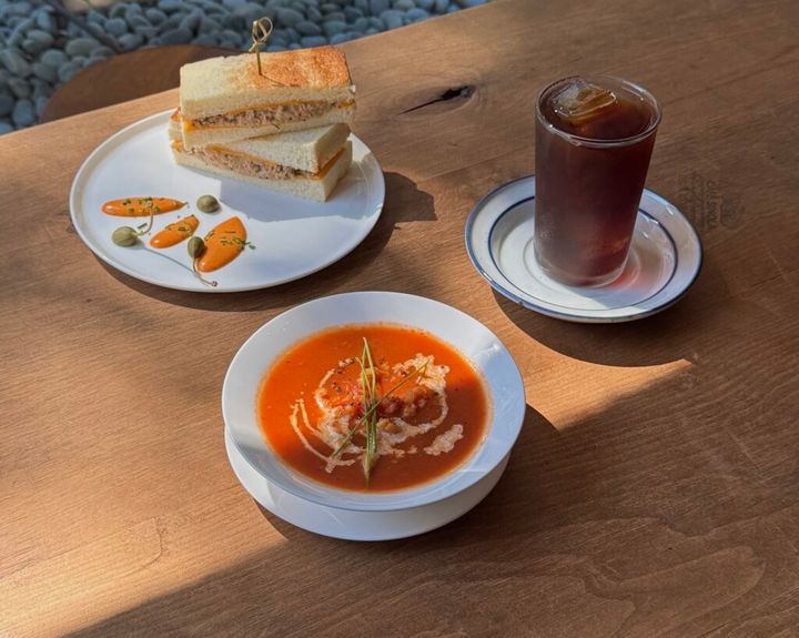 ツナメルトサンドイッチ(11,000ウォン)には、エビトマトスープ(9,000ウォン)を合わせて。ほのかな甘みと紅茶の香りが漂うハウスブレンド「Bフラット」(7,000ウォン)は、アイスでいただくのがおすすめ。