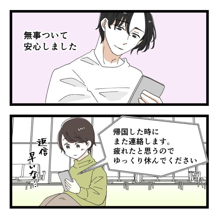 「無事着いて安心しました。帰国した時にまた連絡します。疲れたと思うのでゆっくり休んでください」と返信が。