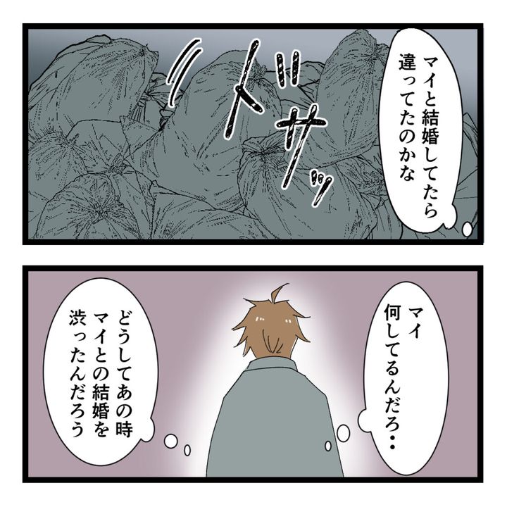 ゴミ出ししながら、「マイと結婚してたら違ってたのかな」と呟くヒロトさんは、「マイ何してるんだろ・・。どうしてあの時マイとの結婚を渋ったんだろう」と自分のしたことを後悔しはじめていました。