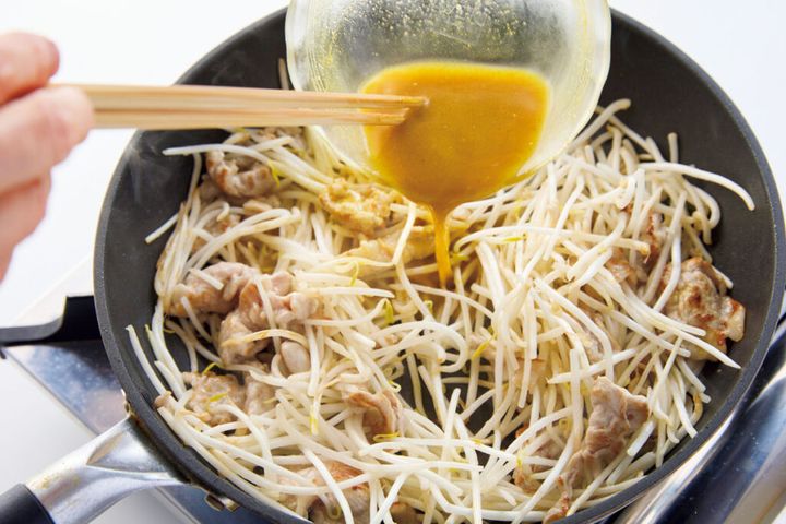 (2)フライパンにサラダ油大さじ1/2を中火で熱し、豚肉を入れて炒める。肉の色が完全に変わったらもやしを加え、強めの中火にしてさっと炒める。Aをもう一度混ぜてから加え、手早く炒め合わせる。