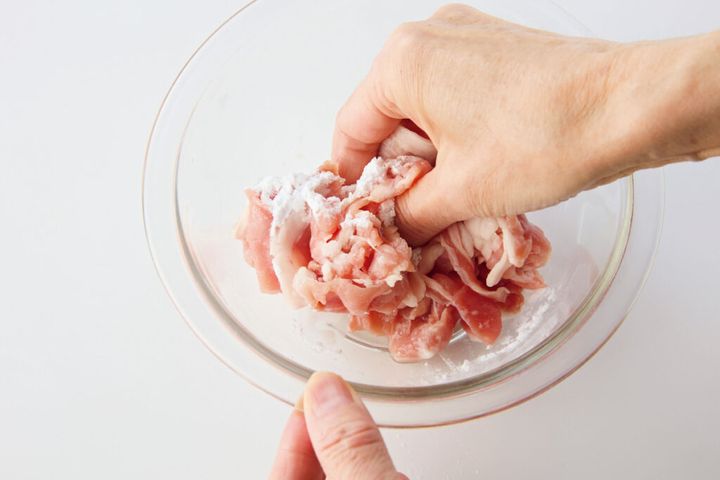 (1)豚肉は大きければ食べやすい大きさに切り、酒大さじ1、片栗粉大さじ1/2をもみ込む。もやしはさっと洗い、しっかりと水けを拭く。〈A〉は混ぜる。