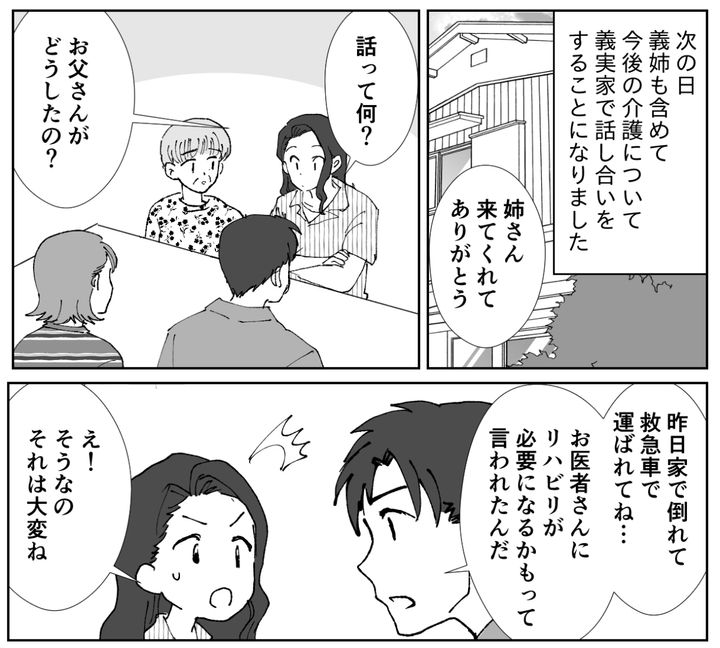 夫に呼び出されて、義実家に話し合いに来た義姉。しかし「介護が必要かもしれない」という言葉を聞いた途端、義姉の態度は豹変。