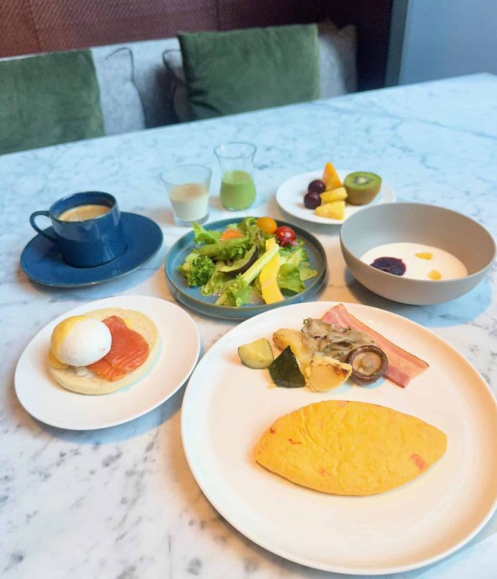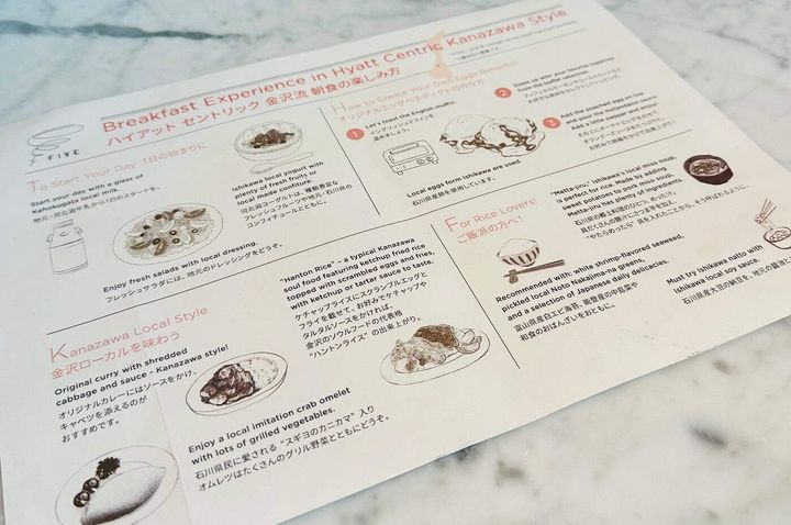 宿泊客の朝食もこちらで。県産のヨーグルトやコンフィチュール、金沢のソウルフード「ハントンライス」、郷土料理のめった汁、県産の納豆や富山の白エビ海苔、能登産の中島菜など、ご当地メニューや地産の和食のラインナップが素晴らしい。